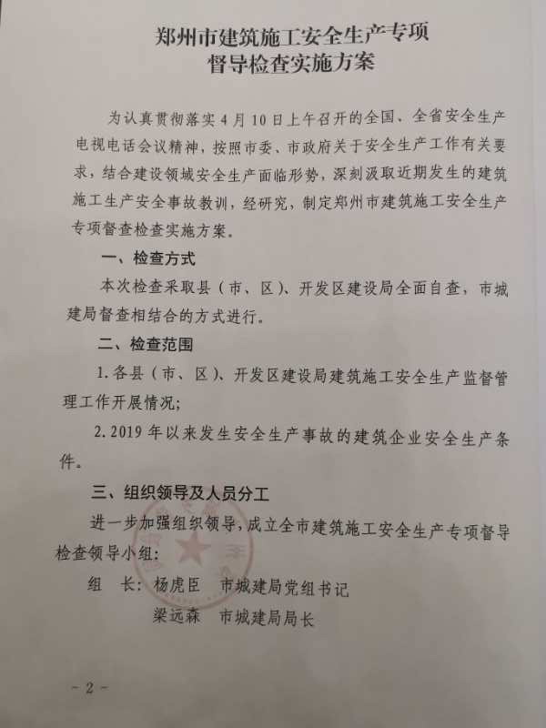 郑州市城乡建设局关于印发《郑州市建筑施工安全生产专项督导检查实施方案》的通知
