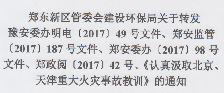 关于转发豫安委办明电【2017】49号文件、郑安监管【2017】187号文件、郑安委办【2017】98号文件、郑政阅【2017】42号、《认真汲取连云港、天津重大火灾事故教训》的通知...[ 了解详情] -
